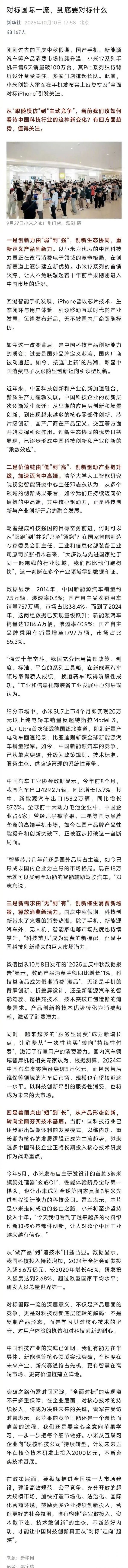 新华社对小米“全面对标苹果”的战略高度肯定,将其视为中国科技产业从“跟随者”向“引领者”转型的标志性事件。首先肯定了小米的突破性意义,以小米17系列为例,其“妙享背屏”设计重构了智能手机交互逻辑(如背屏自拍预览、场景通知),成为国庆消费市场现象级产品。这标志着国产厂商从“被动模仿国外潮流”转向“主动定义技术标准”。中国科技企业创新层次跃迁:从应用层创新转向芯片级(如小米自研3纳米“玄戒O1”处理器)、核心零部件创新,并在产品定义上发挥引领作用。新华社评小米对标苹果还登上了微博热搜。