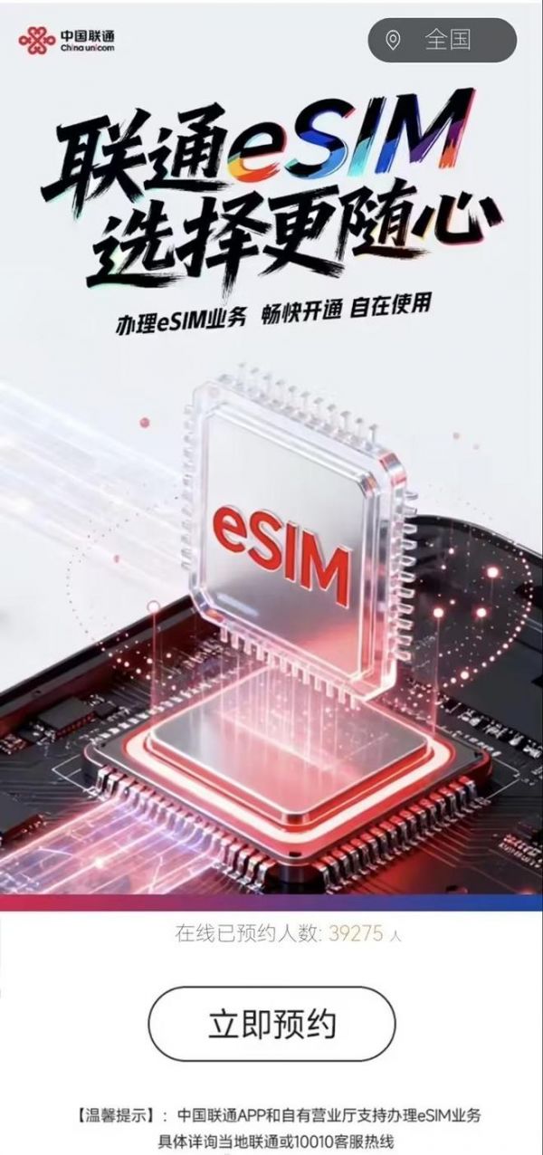 10月11日消息,据IT之家报道,中国联通已正式开启eSIM业务预约通道。截至10月10日,线上预约人数已突破3.9万人。