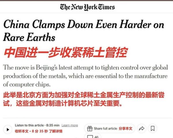 《纽约时报》对中国稀土管制影响的解读,实则勾勒出中美科技博弈的最新轮廓。当台积电因芯片含大陆稀土成分,面临对美出口限制的讨论升温,这场以资源为支点的较量,本质是中国对美国“长臂管辖”的精准回应,更是全球产业链权力重构的生动注脚。
