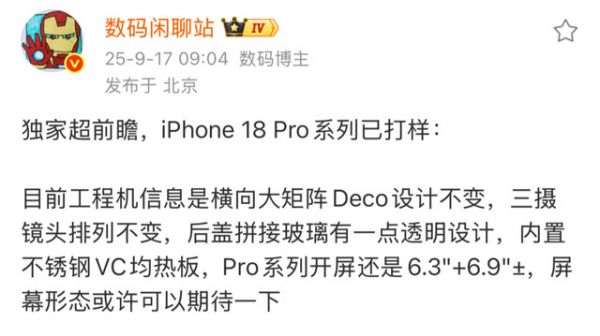另外,数码闲聊站也表示可以期待一下屏幕形态,意味着 iPhone 18 Pro、Pro Max 的正面屏幕打孔会有改进。