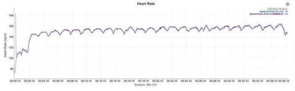 Nick Harris-Fry以Garmin HRM600胸带(电信号级精度)作为对照,结果发现AirPods Pro 3的心率曲线几乎与胸带重合,尤其在稳态跑与间歇跑这种对精度要求极高的场景下,两条曲线如同镜像般贴合。