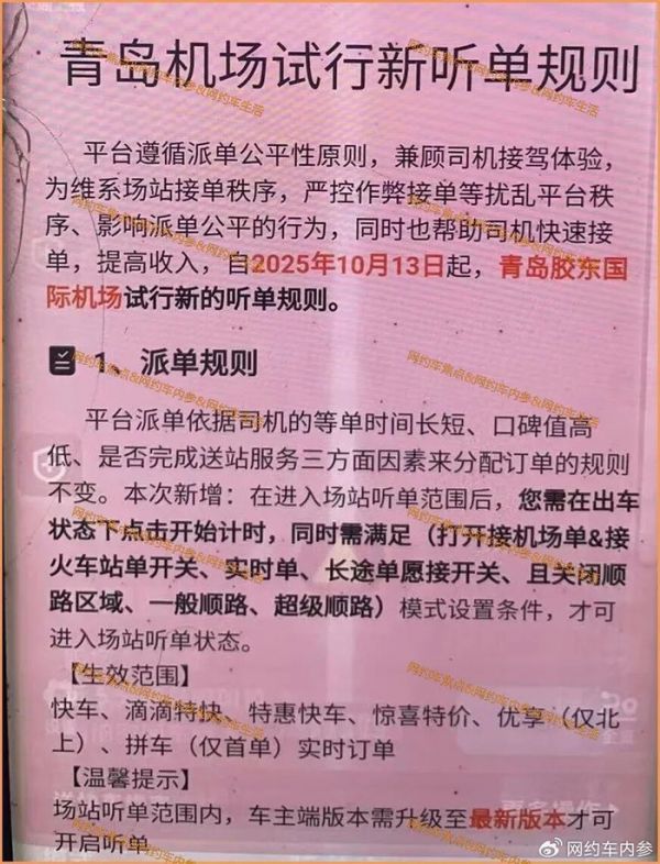 从10月13日起,滴滴司机必须进入青岛胶东国际机场听单范围内,手动点击“开始计时”,并且关闭顺路模式才能进入听单排队。