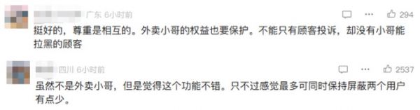 骑手若因为类似情况,收到用户的不合理差评,平台顶多就是删差评,骑手有气没地方撒。要知道,一个差评不止让这单白送,可能让骑手半天都白干。收入、考核都受影响,以前只能忍气吞声。现在有了屏蔽的功能,遇到实在不讲理的,至少有个地方可以躲。