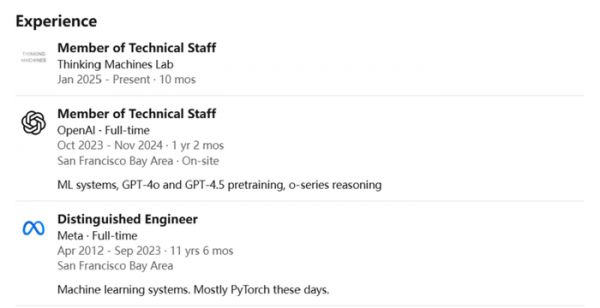 ▲Tulloch的职业经历(图源:领英)而对Thinking Machines Lab而言,Tulloch的离职无疑是一个重大损失。这家AI创企该公司在今年2月份成立时吸引了超过20名前OpenAI工程师加盟,包括多名OpenAI前高管,并在成立后几个月内完成了20亿美元融资。