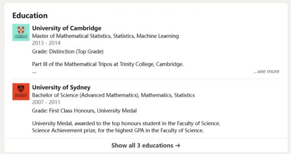 ▲Tulloch的教育经历(图源:领英)之后,Tulloch于2014年在剑桥大学获得数理统计学硕士学位,然后继续在FAIR任职。在FAIR期间,他的工作重点是PyTorch。Tulloch在个人博客中分享,自己曾经大幅提升PyTorch在GPU上的推理性能,还对Torch深度学习库做了清理。