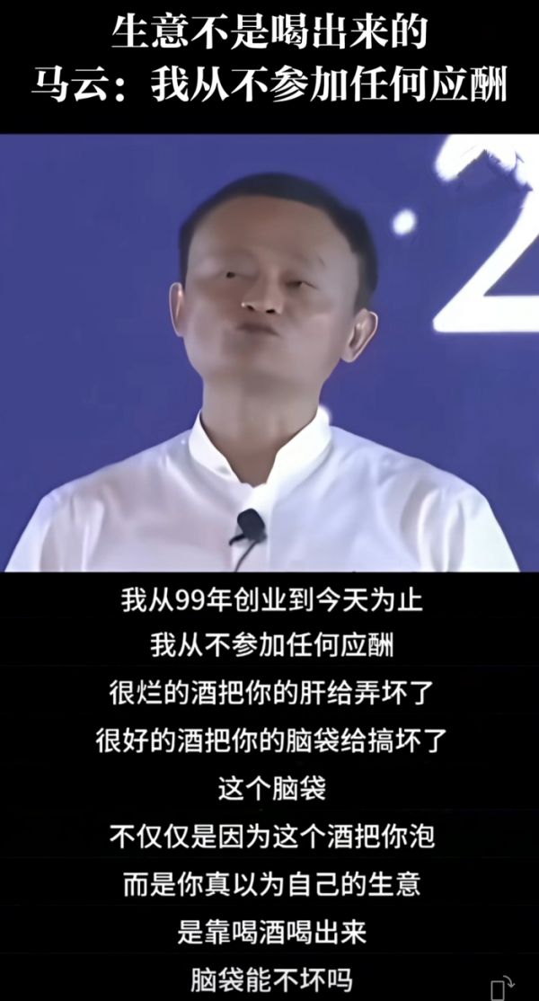 其实把这些事串起来看,就能明白其中的区别。马云说的 “不喝酒”,一直限定在 “商业应酬” 这个场景里。