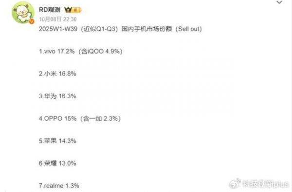 当然,从整个市场表现来看,我其实觉得接下来的4季度,其实是华为、小米的争夺战,而2025年全年发展到最后,估计也是华为、小米的争夺战。