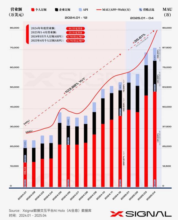 梳理过往 ChatGPT 的用户量增长情况来看,Xsignal AI Holo(AI 全息)数据库数据显示,自 2022 年 11 月发布到 2023 年 12 月,ChatGPT 的 MAU 突破 2 亿,在 2024 年度,MAU 继续从 3.2 亿激增至 6.5 亿,年度增长率高达 103.88%,在今年第一季度,ChatGPT 实现了 35.61% 的显著增长,MAU 接近 9 亿。