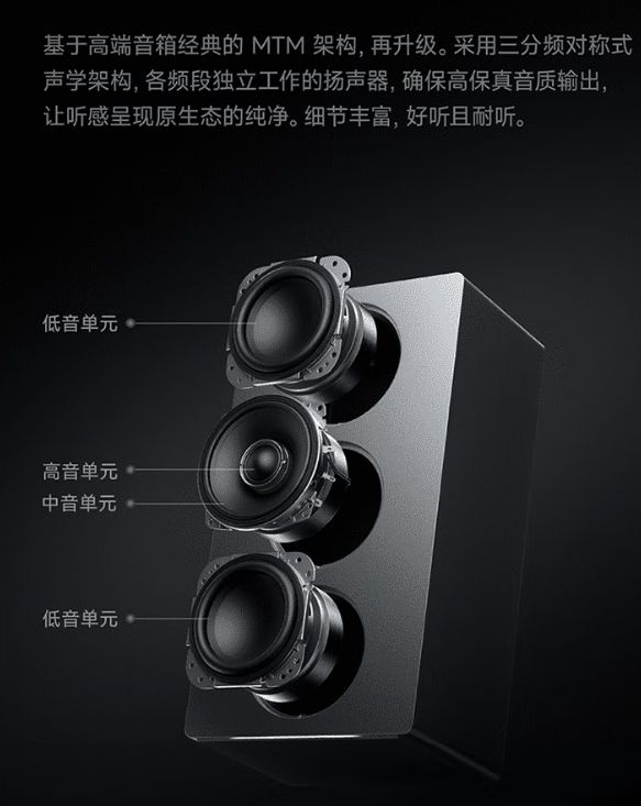 不过话又说回来,HiFi音箱卖的不仅仅是外观,还有音质,那么小米Sound 2 Max的声学架构又是什么配置呢?从小米公布的参数来看,其采用的是三分频对称式架构,上下两个单元为4英寸的30W低频扬声器,中间则是1.5英寸的10W高频扬声器+4英寸的30W中频扬声器的同轴设计。