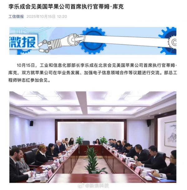 【#工信部部长李乐成会见苹果库克#】10 月 15 日,工业和信息化部部长李乐成在北京会见美国苹果公司首席执行官蒂姆・库克,双方就苹果公司在华业务发展、加强电子信息领域合作等议题进行交流。部总工程师钟志红参加会见。