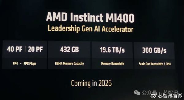 根据AMD在今年6月公布的信息显示,其即将于2026年推出下一代的MI400系列加速器,将基于2nm制程,集成432GB的HBM4内存,内存带宽将达19.6TB/s,单个GPU的横向扩展带宽也将高达300GB/s,而MI400 GPU的算力将高达FP4数据格式下40PFLOPS、FP8格式下20PFLOPS。