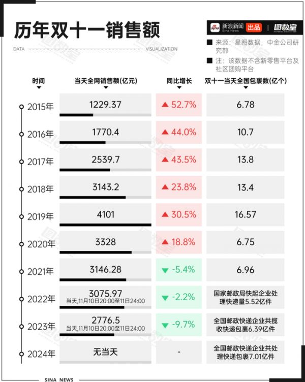 从双十一当天全网销售额来看,近十年时间里,交易额同比增速从52.7%下滑到-9.7%。而包裹数量从2020年开始,出现断崖式下跌,这可能与第一次启用双预售双爆发的活动节奏有关。