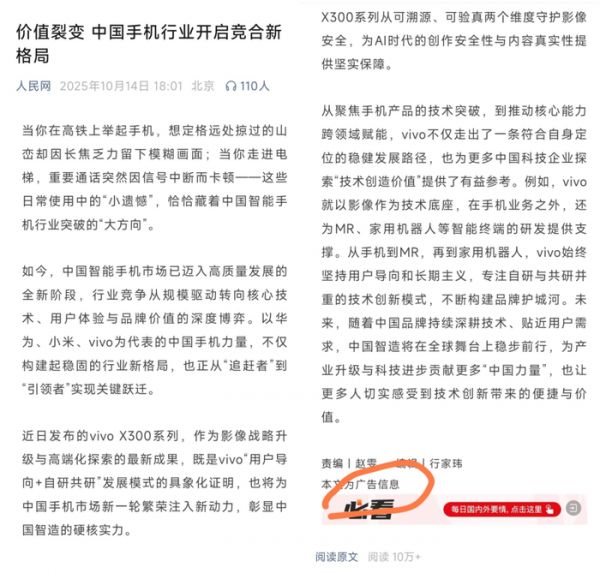 先看vivo,发布X300系列之后,它们在人民网上投了个广告,很有意思。