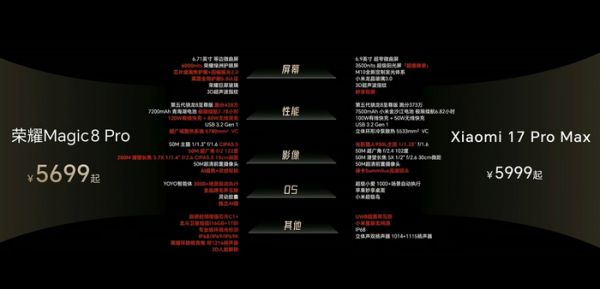 再看荣耀,那就更直接了,在荣耀Magic8系列发布会上,花了老大篇幅,把自己的手机和小米17系列从头到脚比了个遍。