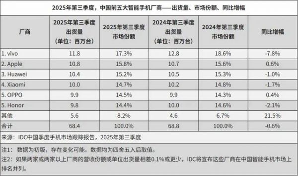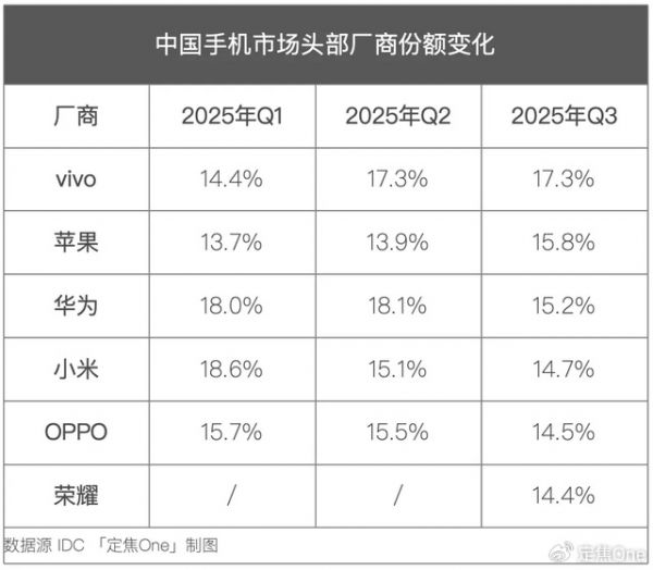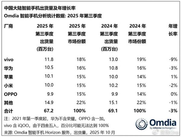 2025年第三季度,中国手机市场同比下降3%。根据Omdia分析师的观点:“年初国补带来的阶段性出货波动正在消退,市场节奏逐步回归常态。”在这样的市场环境中,vivo、苹果、华为用不同的方式,守住了各自的市场份额。