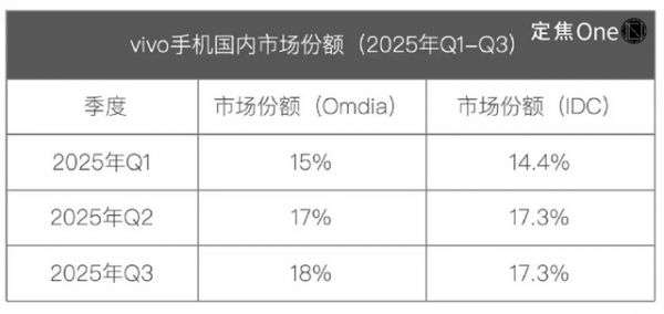 这次轮到vivo。根据Omdia和IDC的数据,vivo以18%左右的市场份额重返榜首。华为与苹果则在15-16%的区间内争夺第二、三名。