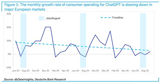德银指出,尽管ChatGPT每周活跃用户达到8亿,但仅2000万为付费用户。且自5月起,欧洲的ChatGPT消费者支出就已经出现停滞,暗示这款产品在吸引新付费客户方面出现瓶颈。