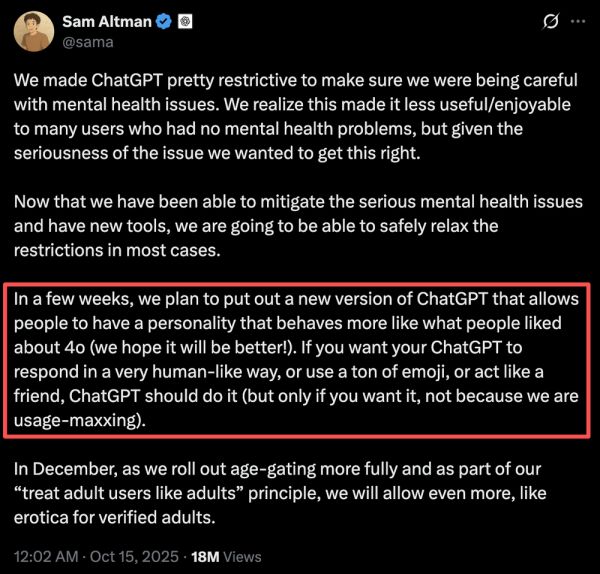 在奥特曼的官宣推文中,除了添加“色情内容”之外,OpenAI 还计划推出新版本的 ChatGPT,其“行为更接近人们喜欢的 4o”。