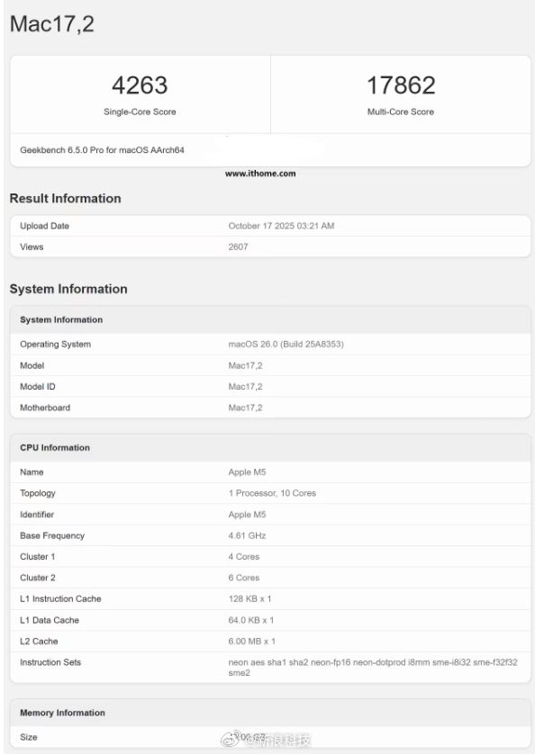 【#苹果M5芯片跑分曝光#:CPU单核提升14%、多核提升21%,GPU提升33%】苹果 M5 MacBook Pro 的 GeekBench 6.5.0 版本跑分已于昨日(10 月 17 日)曝光,单核成绩为 4263 分,多核成绩为 17862 分,对比上一代 M4,其单核与多核性能分别提升约 14% 和 21%,10 核 GPU 性能增幅更是达到 33%。