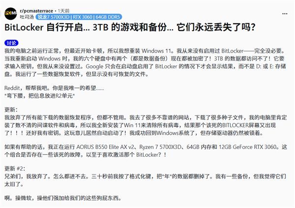 Windows BitLocker自动加密磁盘!3TB宝贵数据丢失:永远无法再找回