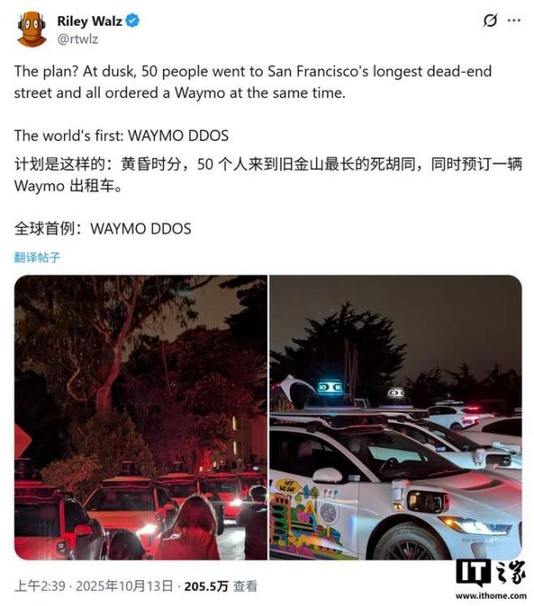 该事件由科技恶作剧者莱利・沃尔兹(Riley Walz)通过社交媒体披露,他详细描述了这场发生在今年 7 月的“测试”过程。据他所述,50 名参与者在旧金山最长的一条死胡同内集合,并在约定好的同一时刻通过手机 App 下单叫车。