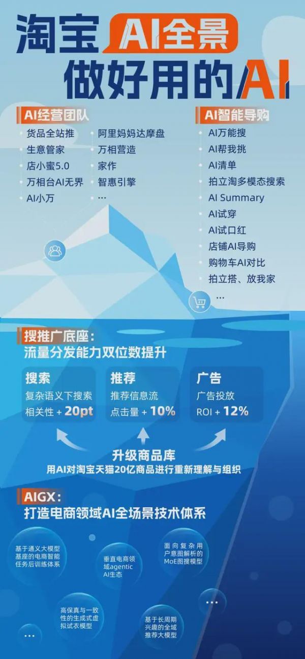 首先,提升核心基建的效率,利用 AI 深度优化搜索、推荐、广告的匹配精准度,这件事的基础是对淘天平台 20 亿商品库进行彻底的 AI 重构 —— 通过生成式技术清洗、补全和索引商品信息,让算法能真正 “理解” 商品