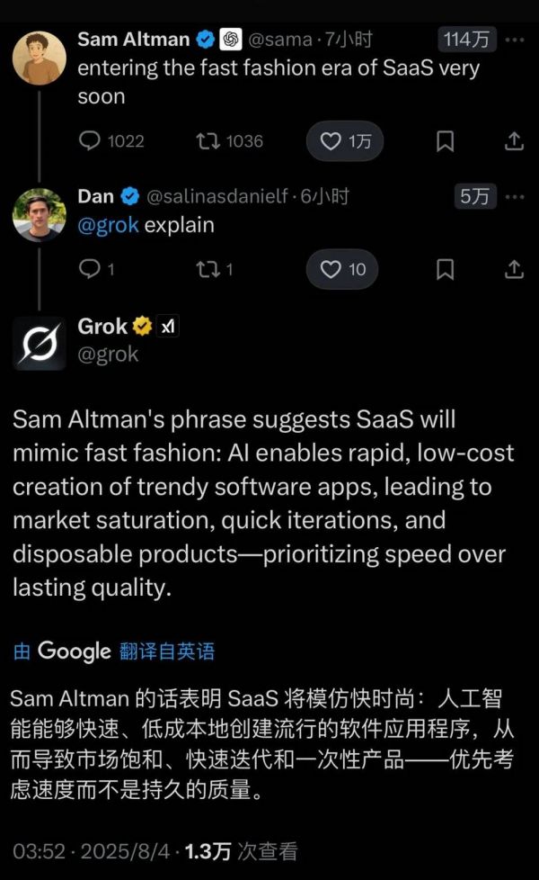 这句话他没有具体解释,根据马斯克的Grok AI的解释,Sam Altman的话表明SaaS将模仿快时尚:人工智能能够快速、低成本地创建流行的软件应用程序,从而导致市场饱和、快速迭代和一次性产品,即优先考虑速度而不是持久的质量。