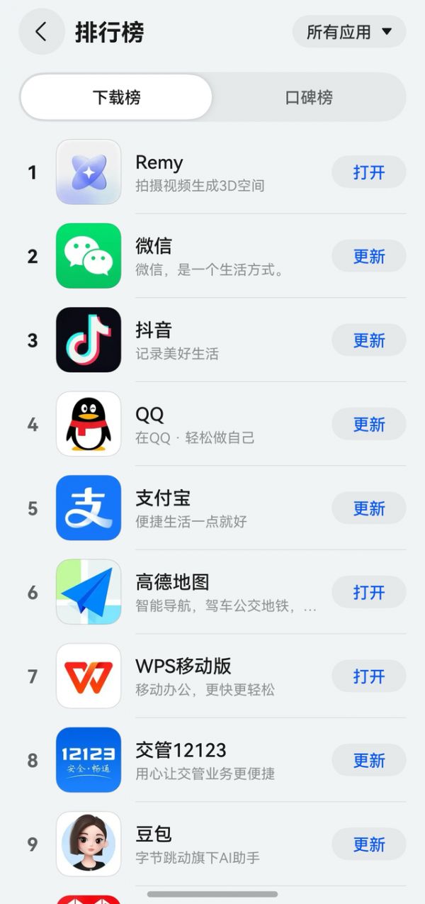 Remy的上架,就像一颗“深水炸弹”,瞬间引爆了首批升级鸿蒙用户的好奇心。上线才几小时,下载量就“坐火箭”一样蹿升,直接把常年“钉子户”鸿蒙版微信挤到了第二,强势登顶应用下载榜。