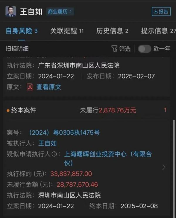 雪上加霜的是,2024年初,王自如因ZEALER对赌失败引发的债务问题曝光——中国执行信息公开网显示,他累计被强制执行超3600万元,叠加利息滚存后,总负债逼近1亿元,正式登上"老赖"名录。