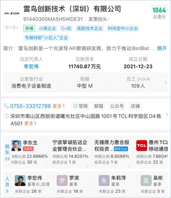 从硬实力来看,雷鸟创新本无需"借力争议人物":股权结构上,据企查查数据显示,TCL创始人李东生以22.9966%持股成为第一大股东,惠州TCL移动通信有限公司持股7.6604%,叠加挚诚拓远、原力惠合等机构股东,公司注册资本达1.17亿元,2024年内完成三轮亿元级融资,资本根基深厚;市场表现上,作为AR眼镜领域的头部玩家,2025年第二季度以39%的全球市场份额登顶AR眼镜销量第一,连续三年半蝉联中国市场冠军,技术与行业地位均已稳居前列。
