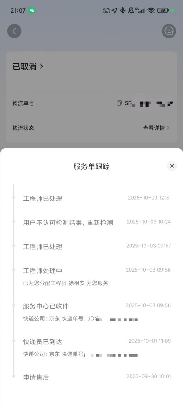 程先生出现问题的“红米K50”手机维修进度单。