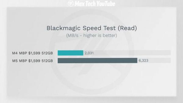 测试结果显示,在 Blackmagic 的顺序读取和写入速度测试中,M5 MacBook Pro 均突破了 6,000MB/s 的大关。具体数据如下: