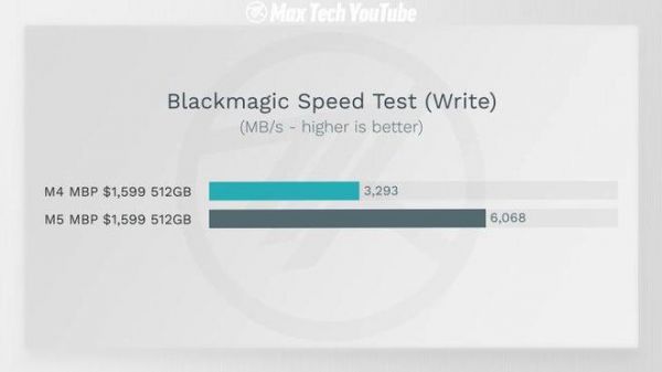 IT之家注意到,深入对比 M5 MacBook Pro 与 M4 MacBook Pro 可以发现,两款设备在内部布局上保持一致,均采用单风扇与单热管散热方案,并配备两颗 NAND 闪存芯片以最大限度提升 SSD 性能。YouTube 科技频道 Max Tech 在展示完这些硬件差异后,立即使用 Blackmagic Disk Speed Test 对两款设备进行了读写速度测试。