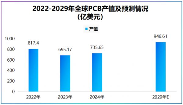 2024年,受益于AI服务器、汽车电子的爆发,PCB行业再次进入上行期,同期全球PCB产值达到735.65亿美元,同比增长5.8%。