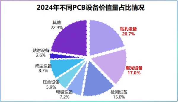 其中,钻孔与曝光设备是PCB专用设备中的价值量高地,前者决定了PCB信号传输性能,后者决定了PCB的精度,二者合计占比达到37.7%。