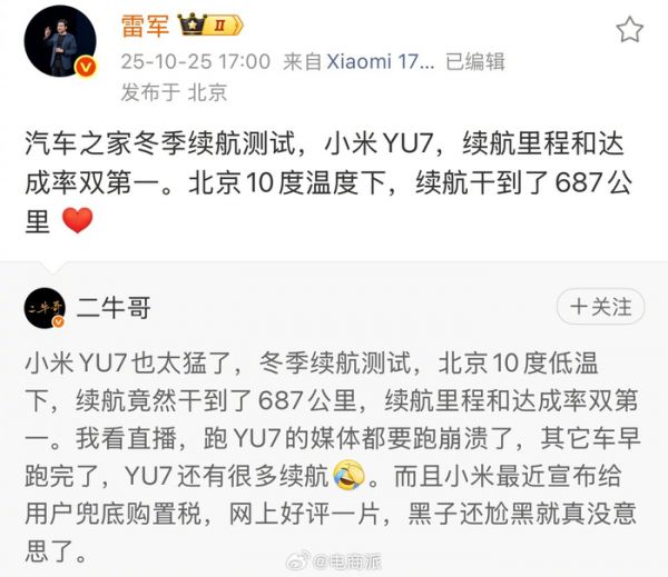 雷军晒小米YU7冬测双第一数据,回应网友质疑