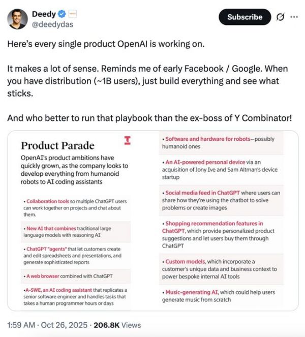 顶级分发渠道(ChatGPT)+ 铺开多条产品线——人形机器人、Agent、个人AI设备、社交、浏览器、购物、音乐、定制化模型……啥都有。