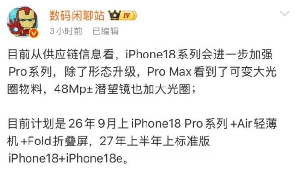 现在更多的还是 iPhone 18 Pro 系列的消息,知名爆料博主数码闲聊站分享了来自于供应链的最新信息。