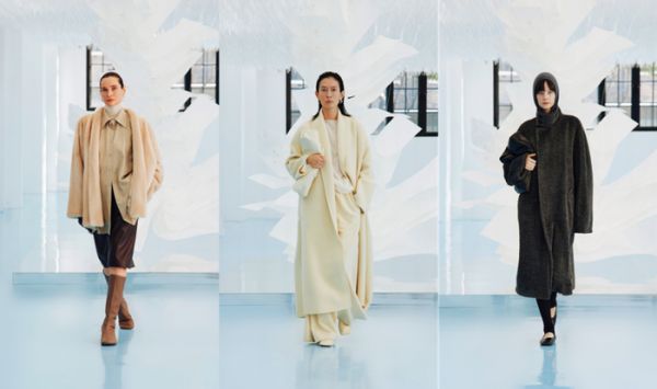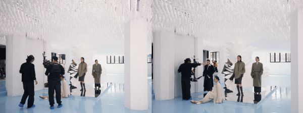 图说:开场前,模特和摄制组工作人员正在为大秀做准备镜头推进位于上海苏河皓司的秀场直播间——曾登上过VOGUE封面的超模刘欣瑜身着杏色针织衫和同色系阔腿裤,外搭奶油白羊绒双面昵大衣,衣摆随步伐垂坠出流畅弧度,在现场白色装置的柔光下,大衣的挺阔和针织的服帖,意大利全羊绒的质感纤毫毕现。