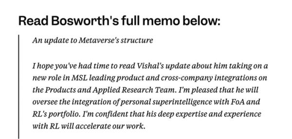 据Meta内部备忘录,此次调任,沙阿将担任Meta超级智能实验室产品和应用研究部门的AI产品副总裁,直接向AI产品负责人纳特·弗里德曼(Nat Friedman)汇报,工作重点是将Meta的AI技术融入到公司的应用平台和可穿戴设备中。