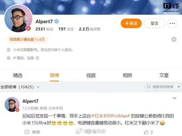 【#产品经理回应红米干翻小米#】在 10 月 23 日晚,小米 REDMI K90 系列手机正式发布。小米法国摄影师 @Alpert7 今日发文称,自己手上的 REDMI K90 Pro Max 手机按键公差做得比自己的小米 15Ultra 好,电源键音量键晃动很小。红米又干翻小米了。