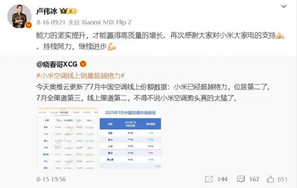 扯远了,说回空调。小米空调近年来高歌猛进,2025年第一季度出货110万台,同比增长65%;第二季度出货超540万台,同比增长超60%。截至9月18日:总销量已达750万台,超越2024年全年销量。