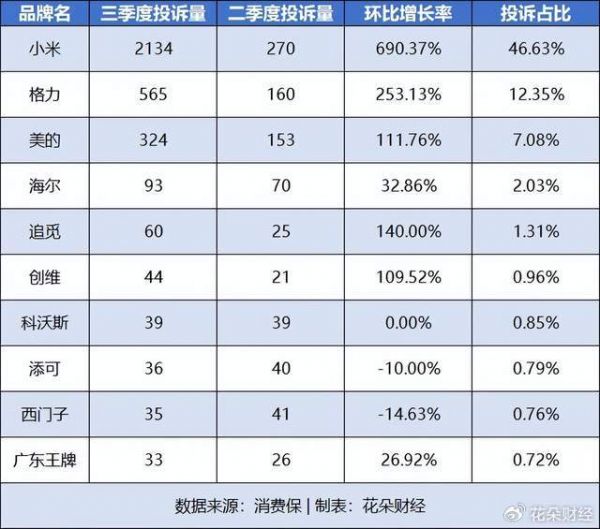可随之而来的是投诉量疯涨。消费保平台统计数据显示,2025年前三季度家电投诉量为4576件,而小米一家就独占了2404件,占比高达46.63%,比格力、美的、海尔等前十品牌加起来都多。换句话说,市场上每产生两起家电投诉,就有一起与小米有关。