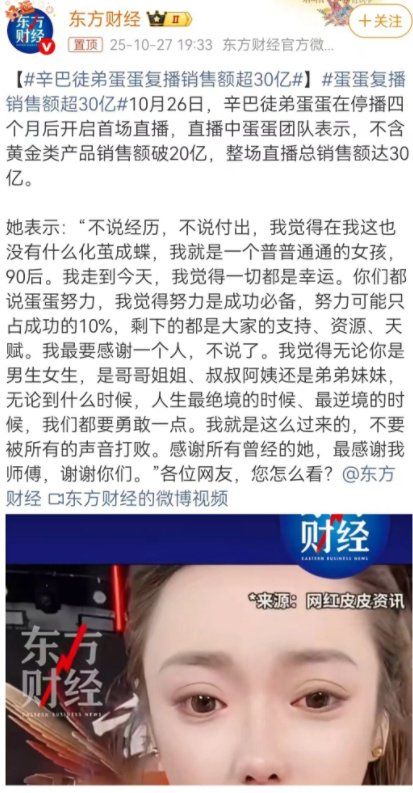 辛巴徒弟停播4个月后复播,当天创下30亿成交额,并公布停播原因,沉寂了整整四个月的辛巴徒弟——蛋蛋,终于在双11大促的节点重返直播间,并以一场惊人的“王者归来”证明了自己的带货实力,首场直播销售额高达30亿元,其中不含黄金类产品的销售额便突破20亿,这一数字不仅震撼了整个电商圈,也让外界再次认识到她作为全网首个粉丝过亿女主播的巨大号召力。