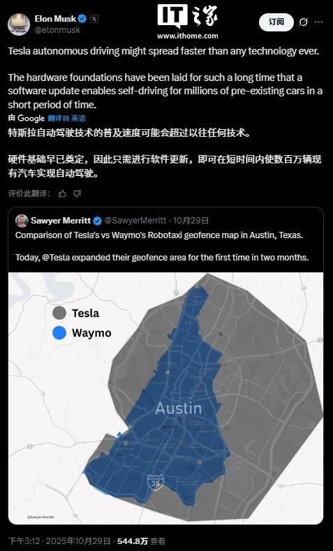 马斯克的上述言论是对行业观察者索耶・梅里特(Sawyer Merritt)所发布内容的回应。梅里特此前发布了一张对比图,展示了特斯拉 Robotaxi 网络与谷歌旗下 Waymo 服务区域的地理覆盖范围。从图表可见,特斯拉在奥斯汀划定的运营区域已明显超过 Waymo 的服务范围。