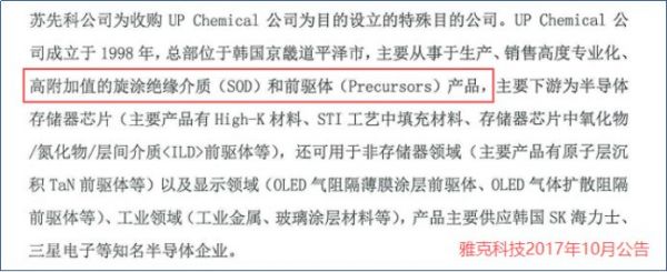控股江苏先科,从而间接掌控了韩国UP Chemical,一举填补了国内半导体前驱体材料的空白。