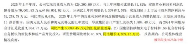 1. 汇兑损益“捣鬼:2024年上半年,公司有0.38亿元的汇兑收益,而2025年上半年,因为汇率波动,变成了0.19亿元的汇兑损失。这一正一反,账面上就差了5700万元。