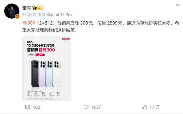 对此,小米创始人雷军微博回应,称内存涨价“非常离谱”,小米总裁卢伟冰也无奈表示:“这不是我们能控制的。”为了安抚用户情绪,小米罕见地在首销月临时降价300元,把512GB版本拉回到2899元。