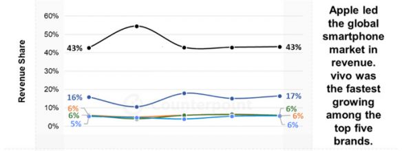 不过去年同期vivo的营收占比仅有5%,所以Counterpoint表示vivo营收是前五手机厂商中增长最快的,同比增速达到12%。