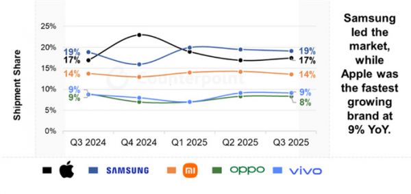 Counterpoint今天公布2025年第三季度全球智能手机收入相关数据。调查显示,该季度全球智能手机收入同比增长高达5%,达到1120亿美元,创下历年第三季度新高。